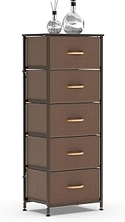 DHMAKER 縦型ドレッサー収納タワー スチールフレーム 木製トップ 簡単に引っ張るテクスチャードファブリックビン - オーガナイザーユニット 寝室 廊下 玄関 クローゼット - 5つの引き出し - ブラウン